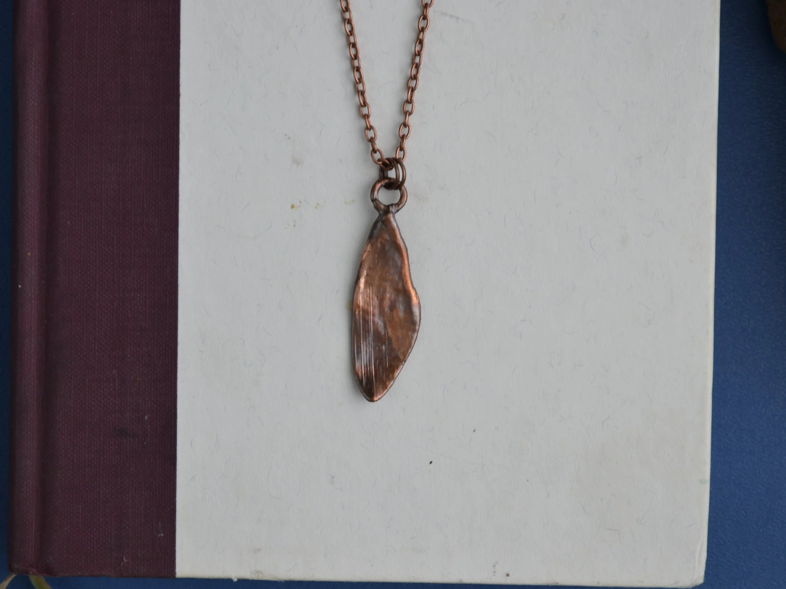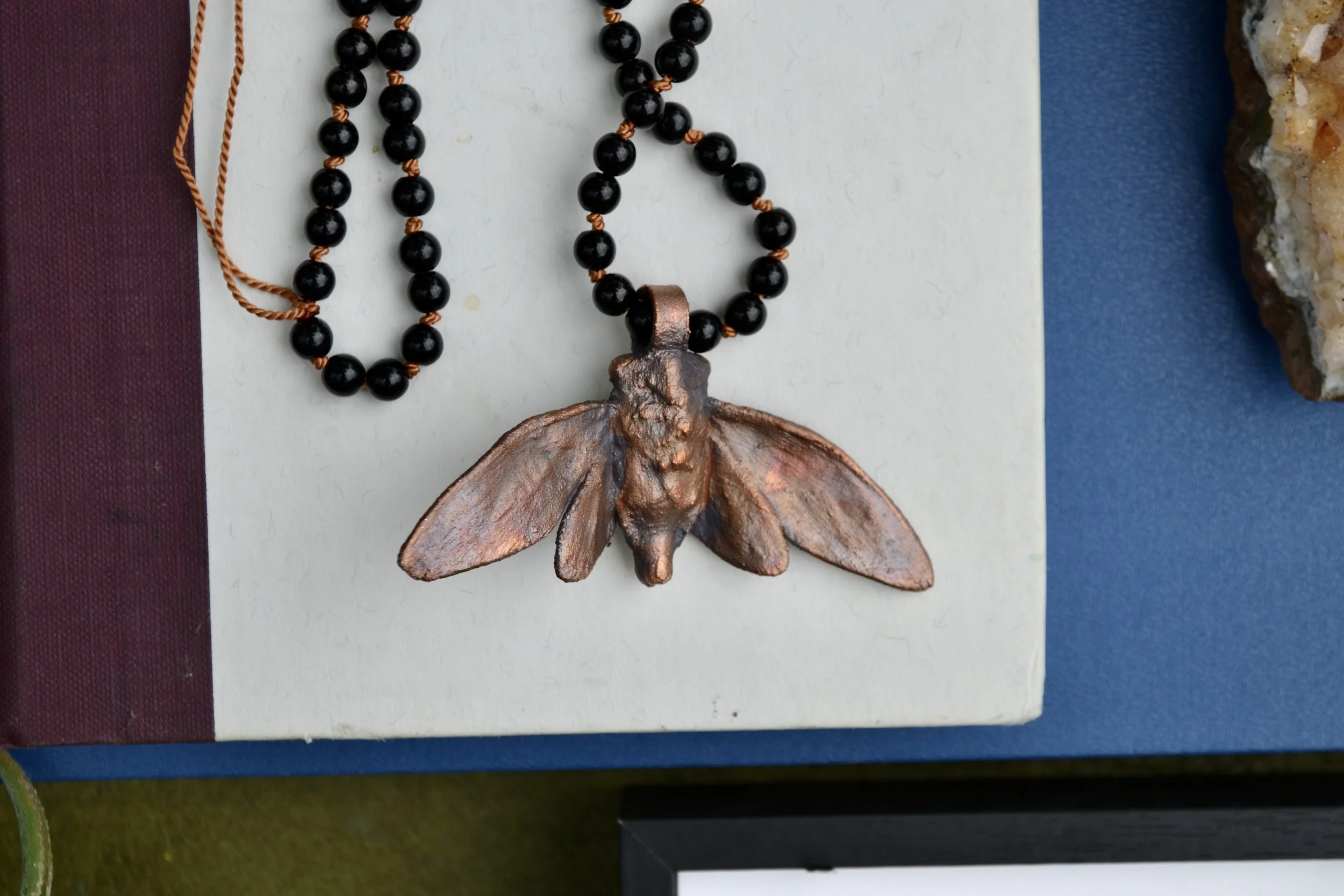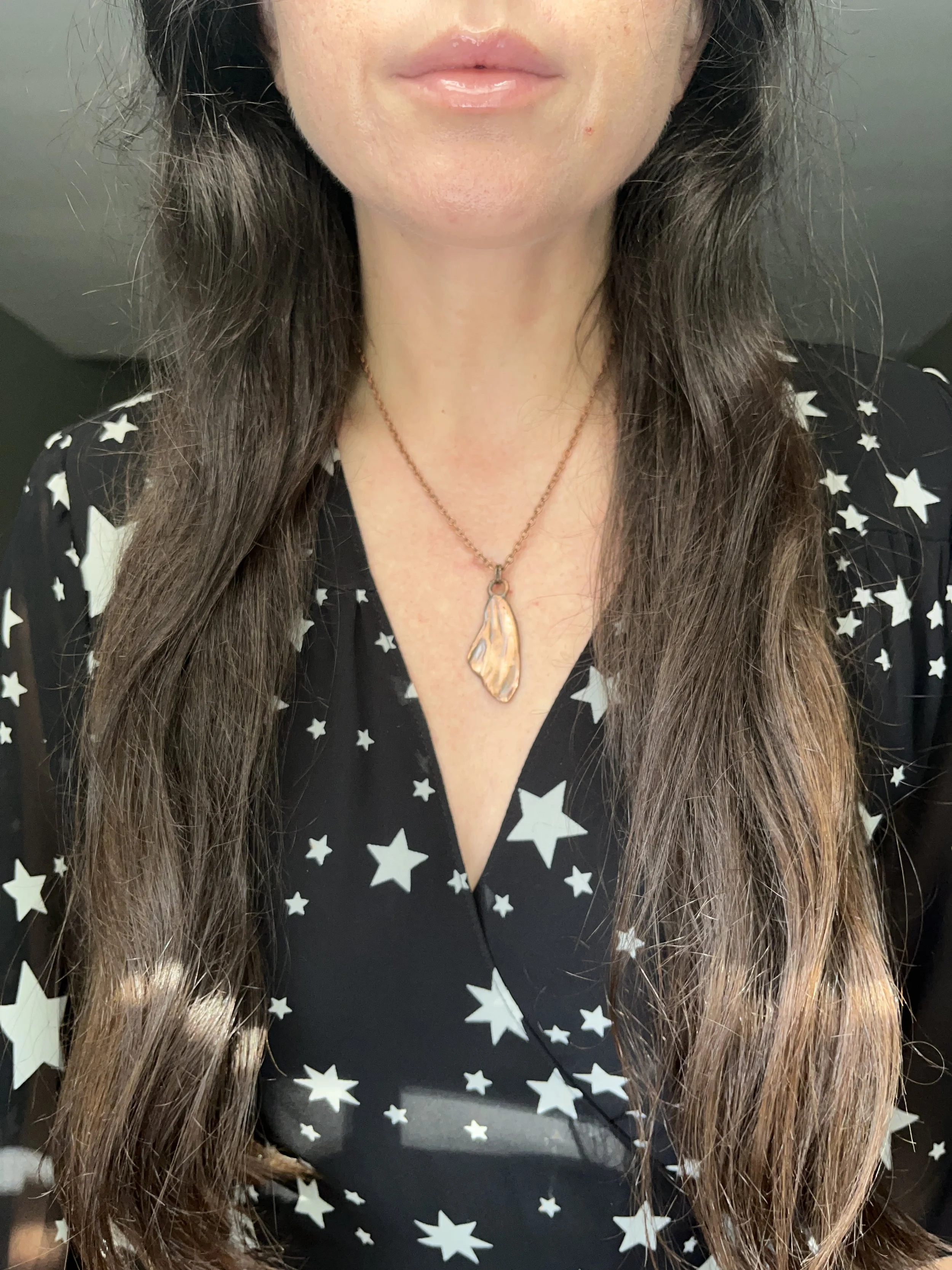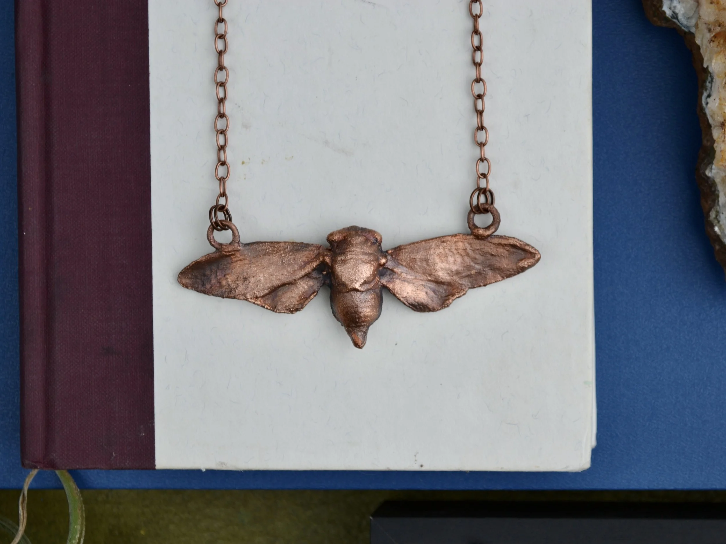 The copper part of this necklace is made using over several hour process called electroforming, where copper forms around the natural shape of the stone creating a unique organic feeling piece. The piece was then given a patina which will continue to develop overtime.