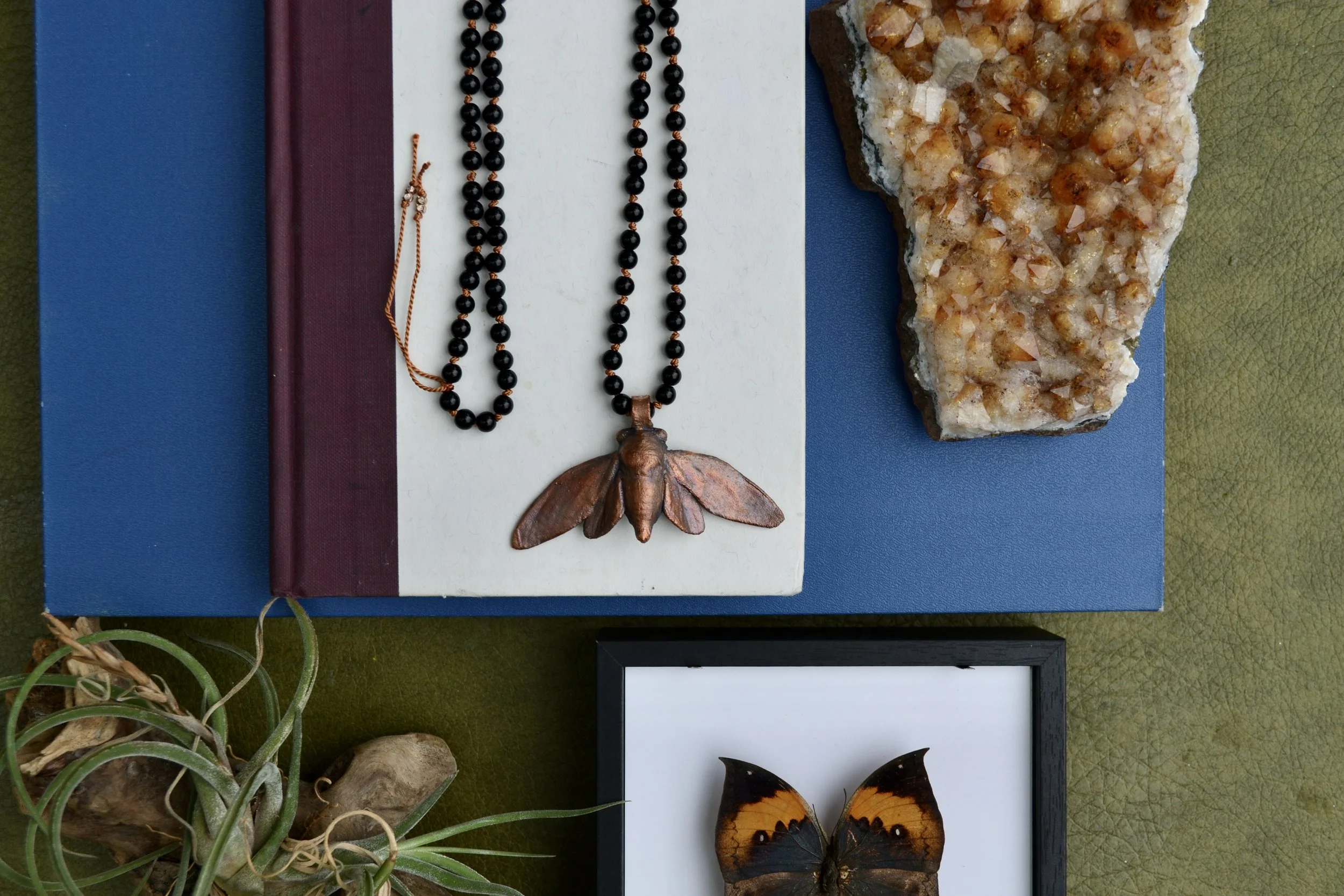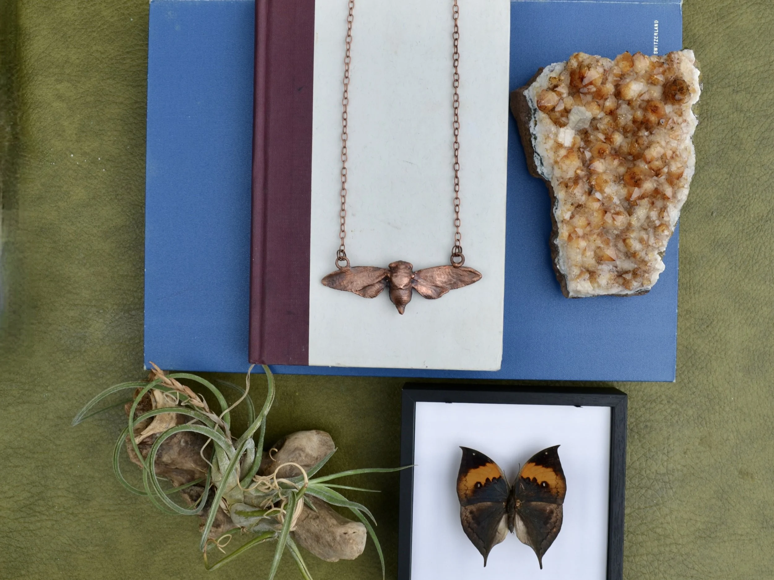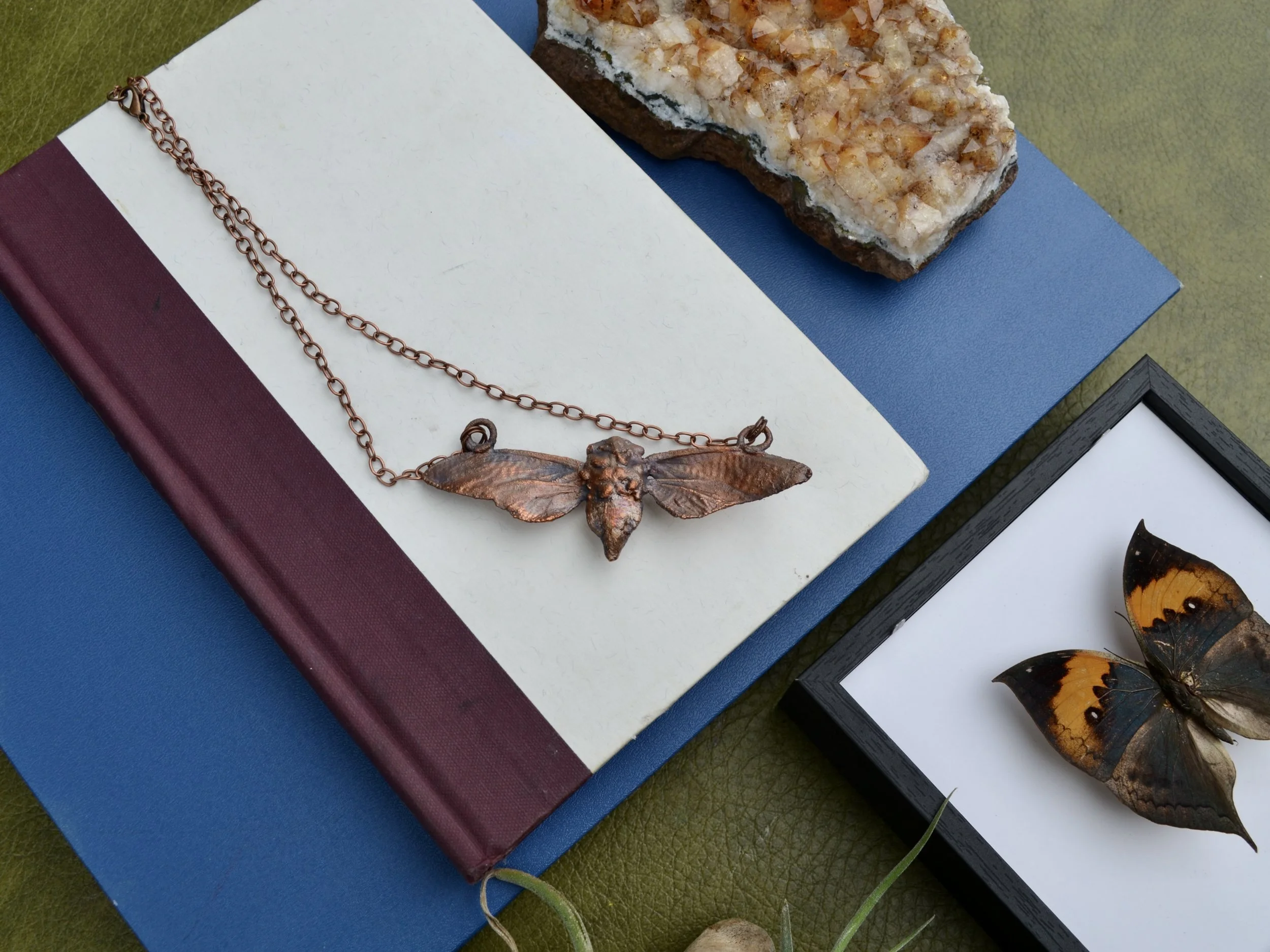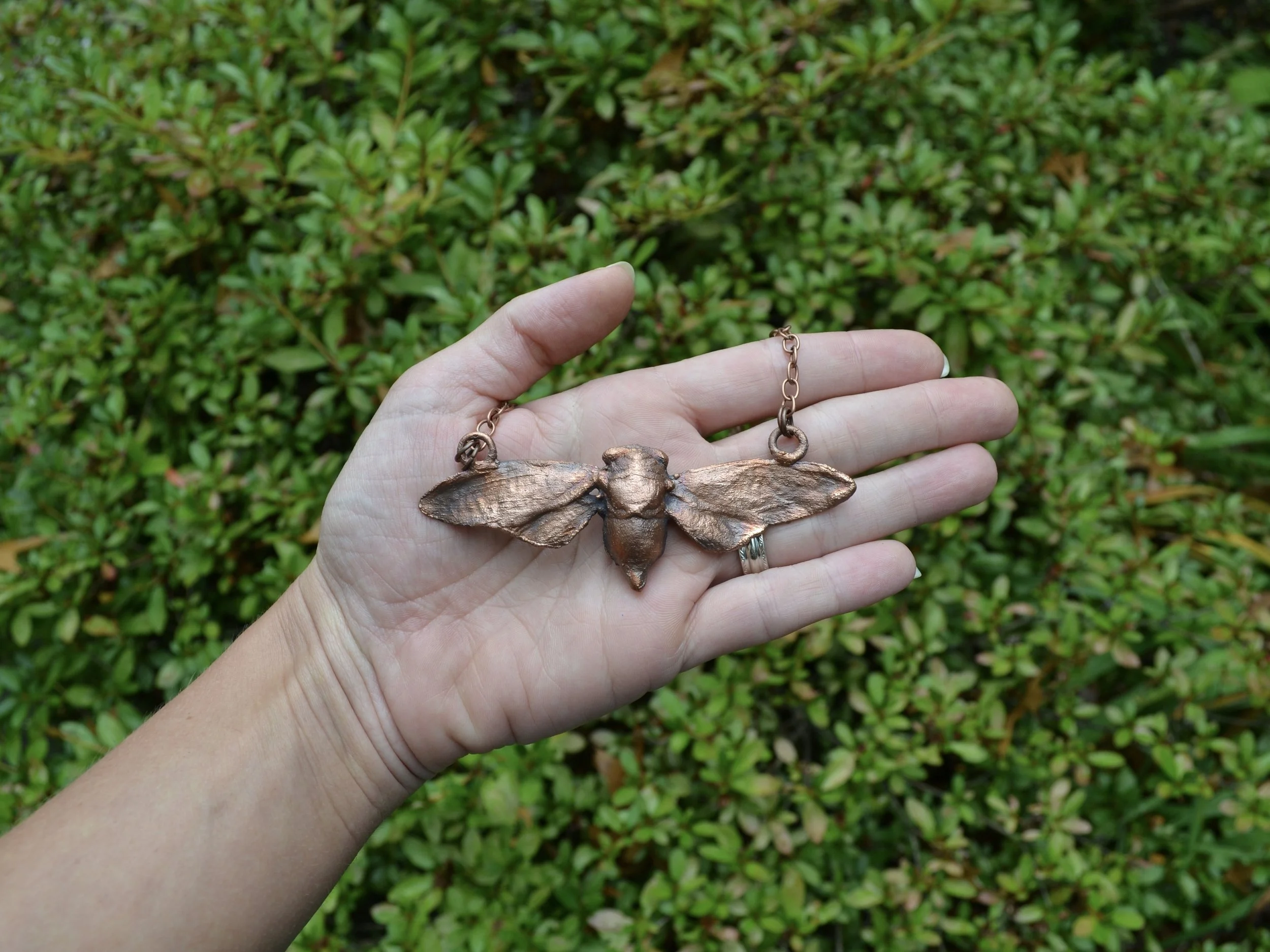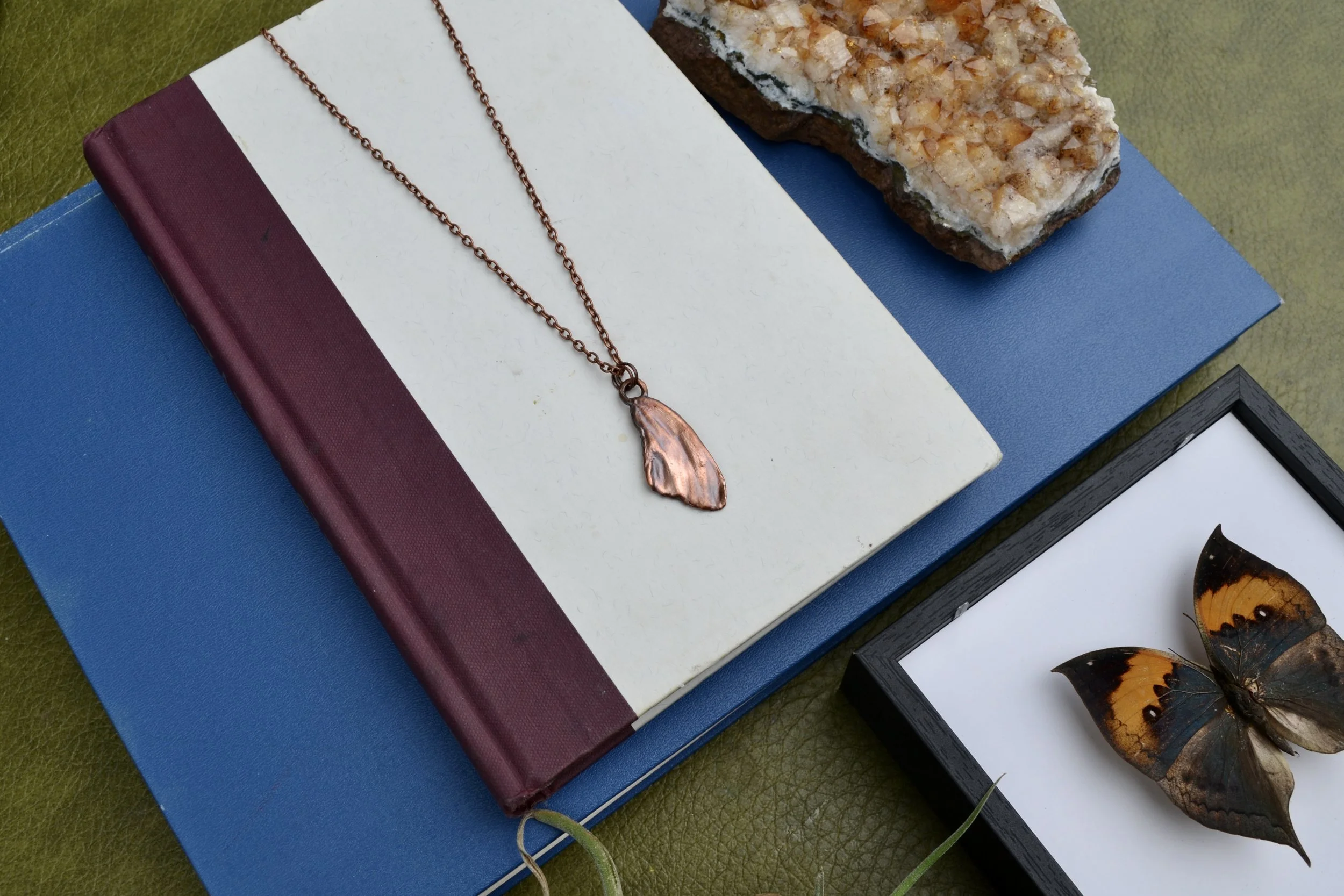 The copper part of this necklace is made using over several hour process called electroforming, where copper forms around the natural shape of the stone creating a unique organic feeling piece. The piece was then given a patina which will continue to develop overtime.