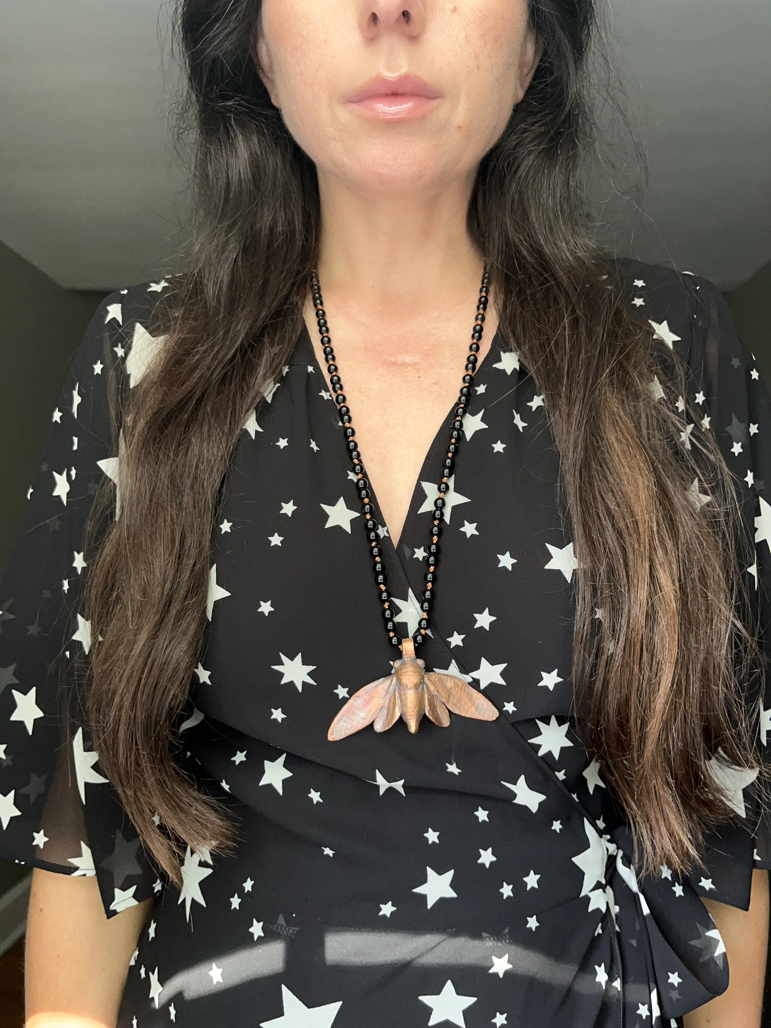 Beautiful large magnesite turquoise with an inlaid black onyx stone set in electroformed copper and strung on a long antique copper plated chain. Chain measures 28” long, no clasp - one can be added upon request.